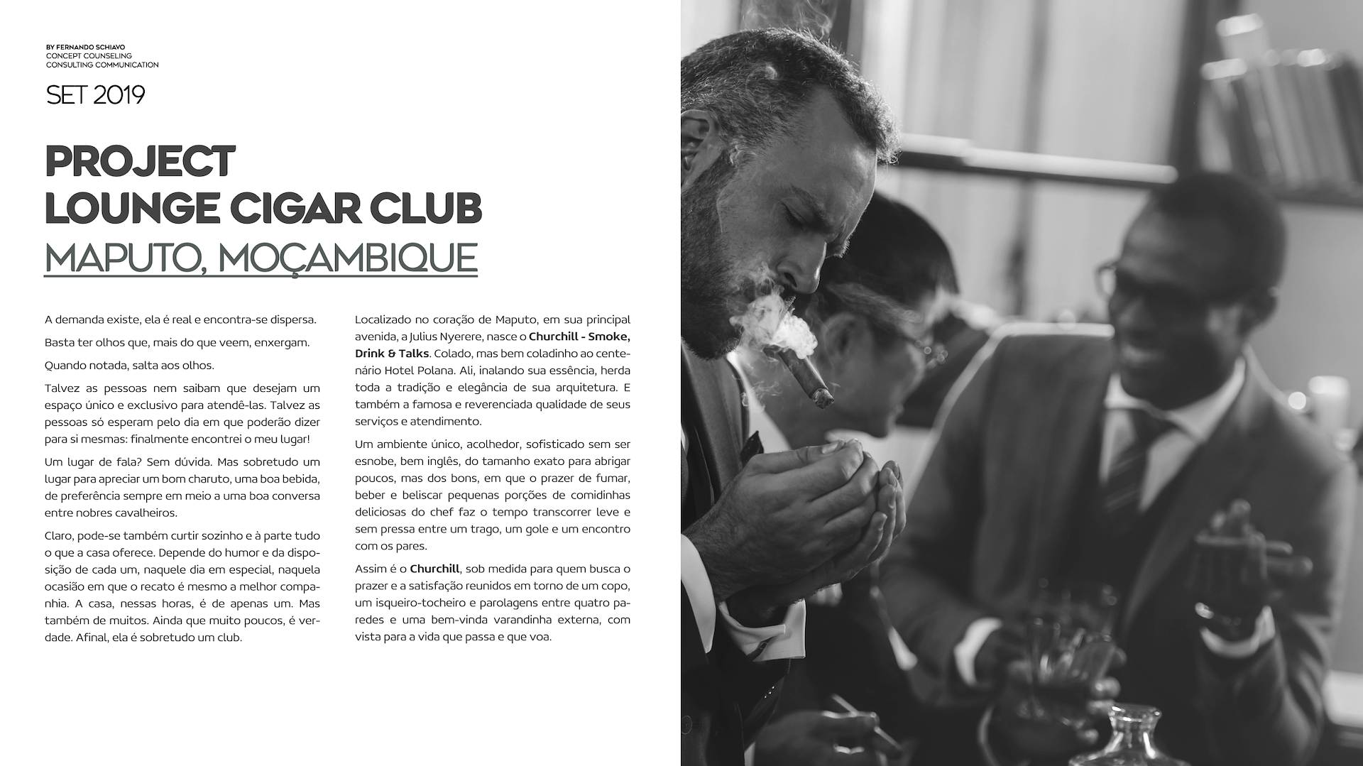 Desenvolvimento de conceito. Plano de negócios. Criação de logo, identidade visual e naming. Campanha de comunicação. O projeto está em andamento. A ideia central é a de criar um espaço, na cidade de Maputo, em Moçambique, de um clube privado para apreciadores de charuto, espaço este hoje inexistente em todo o território.