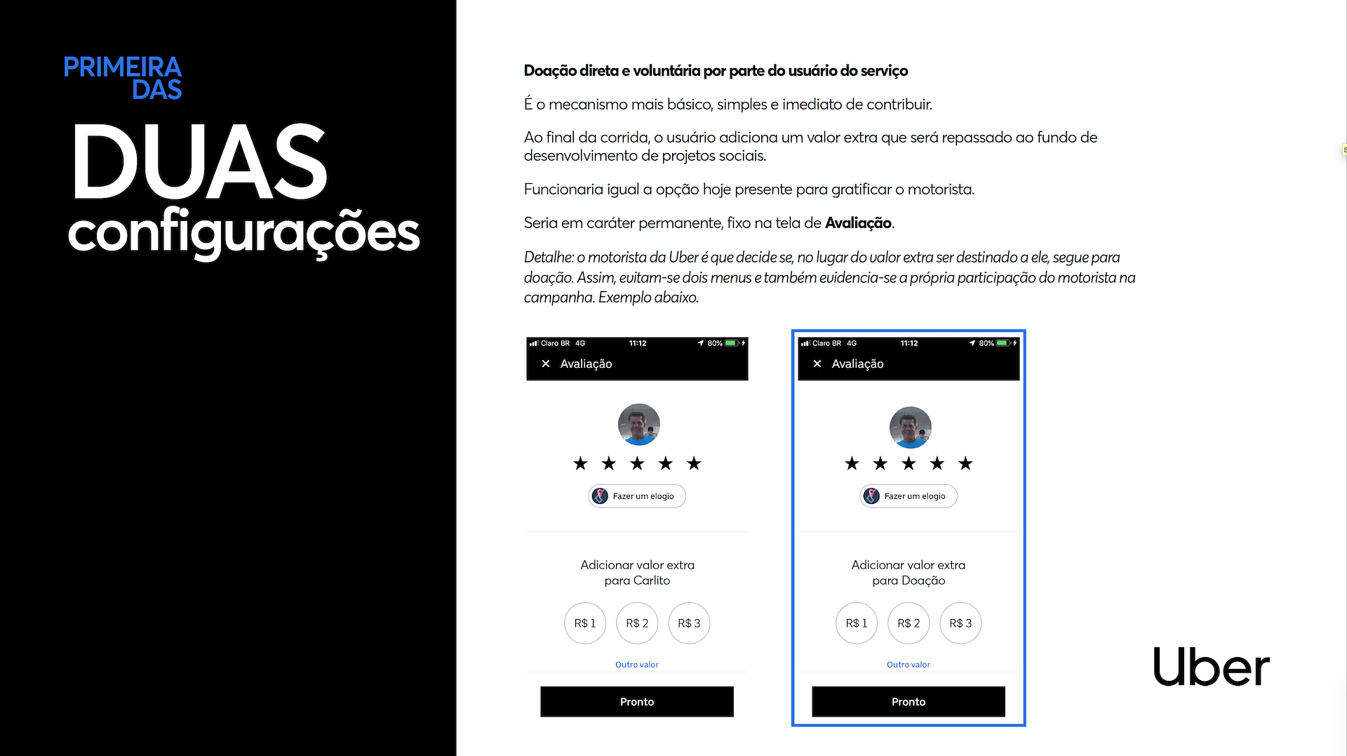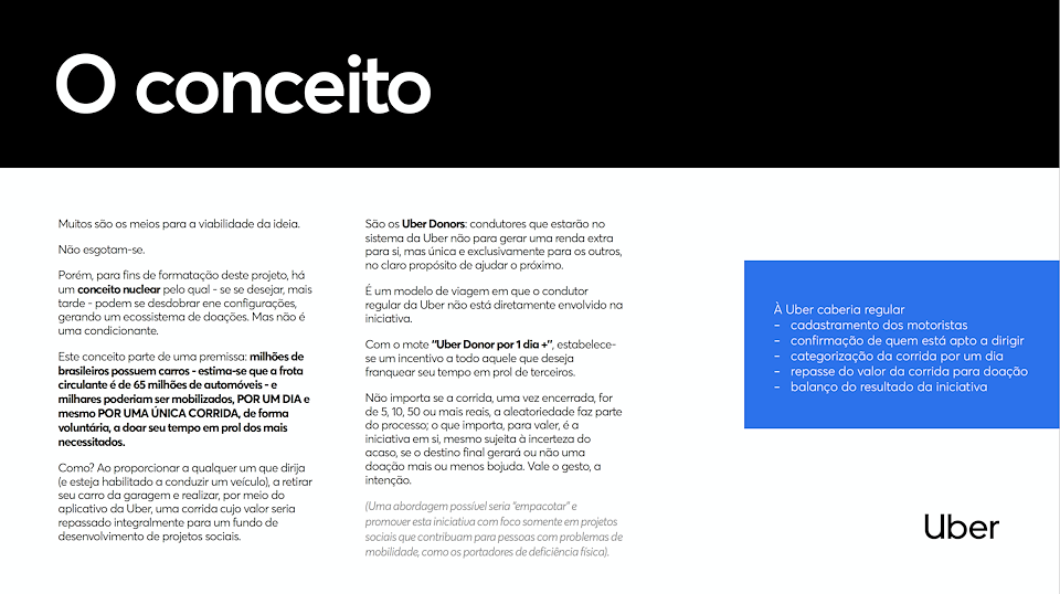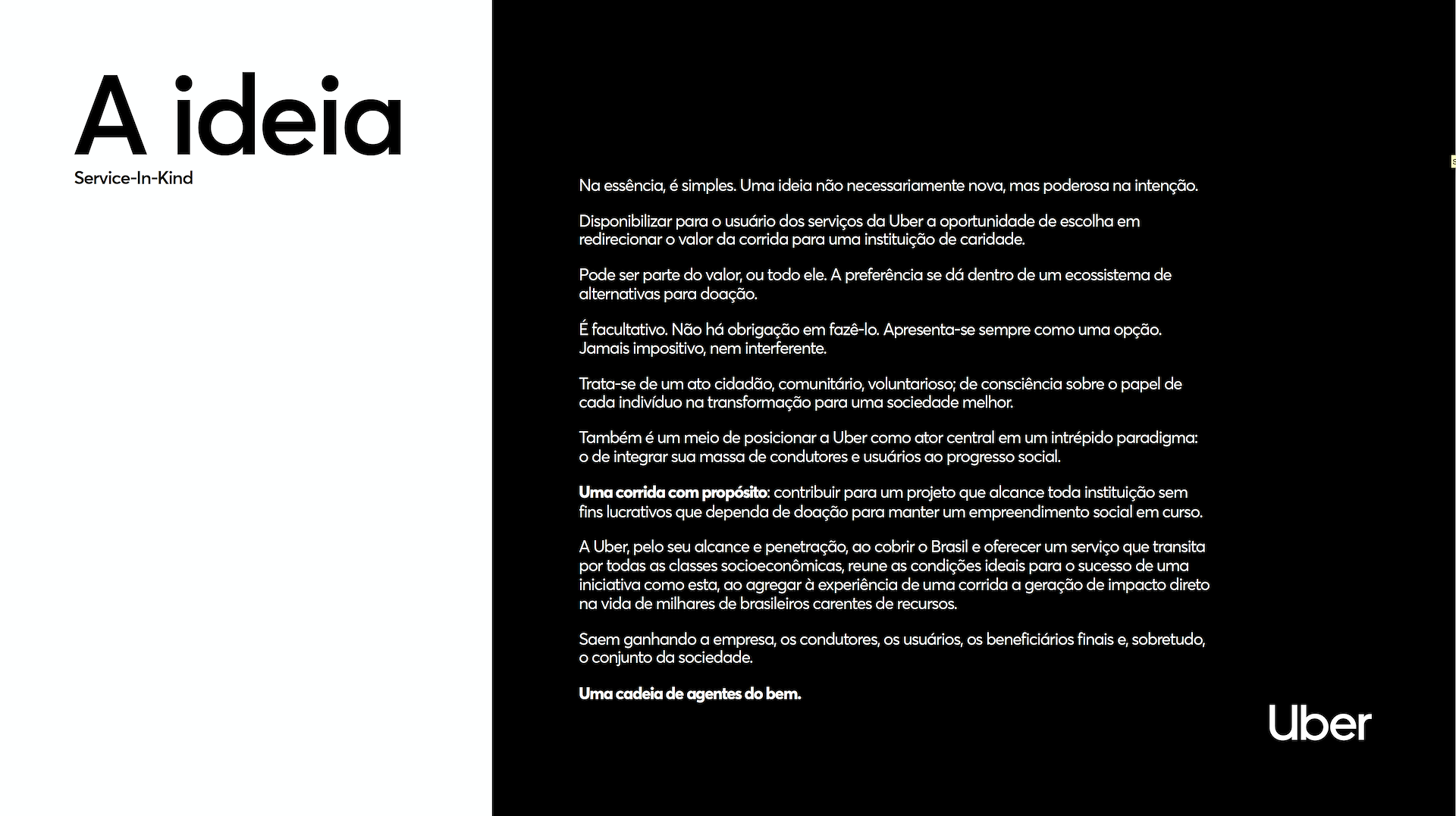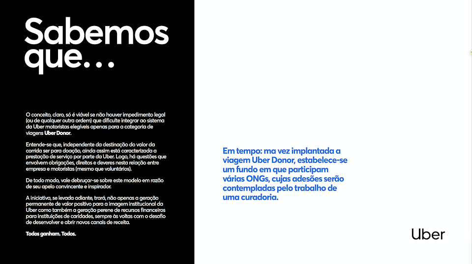 Argumentação, textos, desenvolvimento de projeto comercial e direção de arte. Conceito original de autoria de Carlito Gini. Versões adaptadas para 99 TÁXI e CABIFY. Projeto ainda à mesa de negociação.